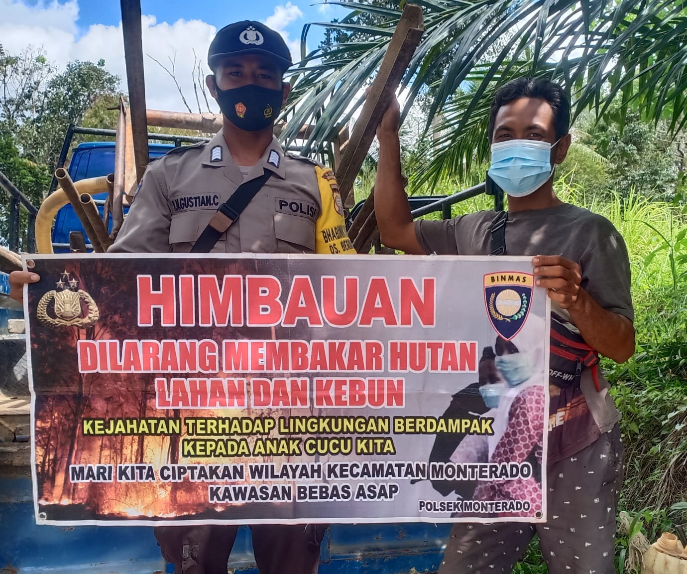 Polres Bengkayang, Polsek Monterado-Bhabinkamtibmas Polsek Monterado Bripka Gustian dalam rangka mencegah terjadinya kebakaran hutan dan lahan (Karhutla) di Desa binaan membentangkan banner berisikan himbauan larangan membakar hutan dan lahan.