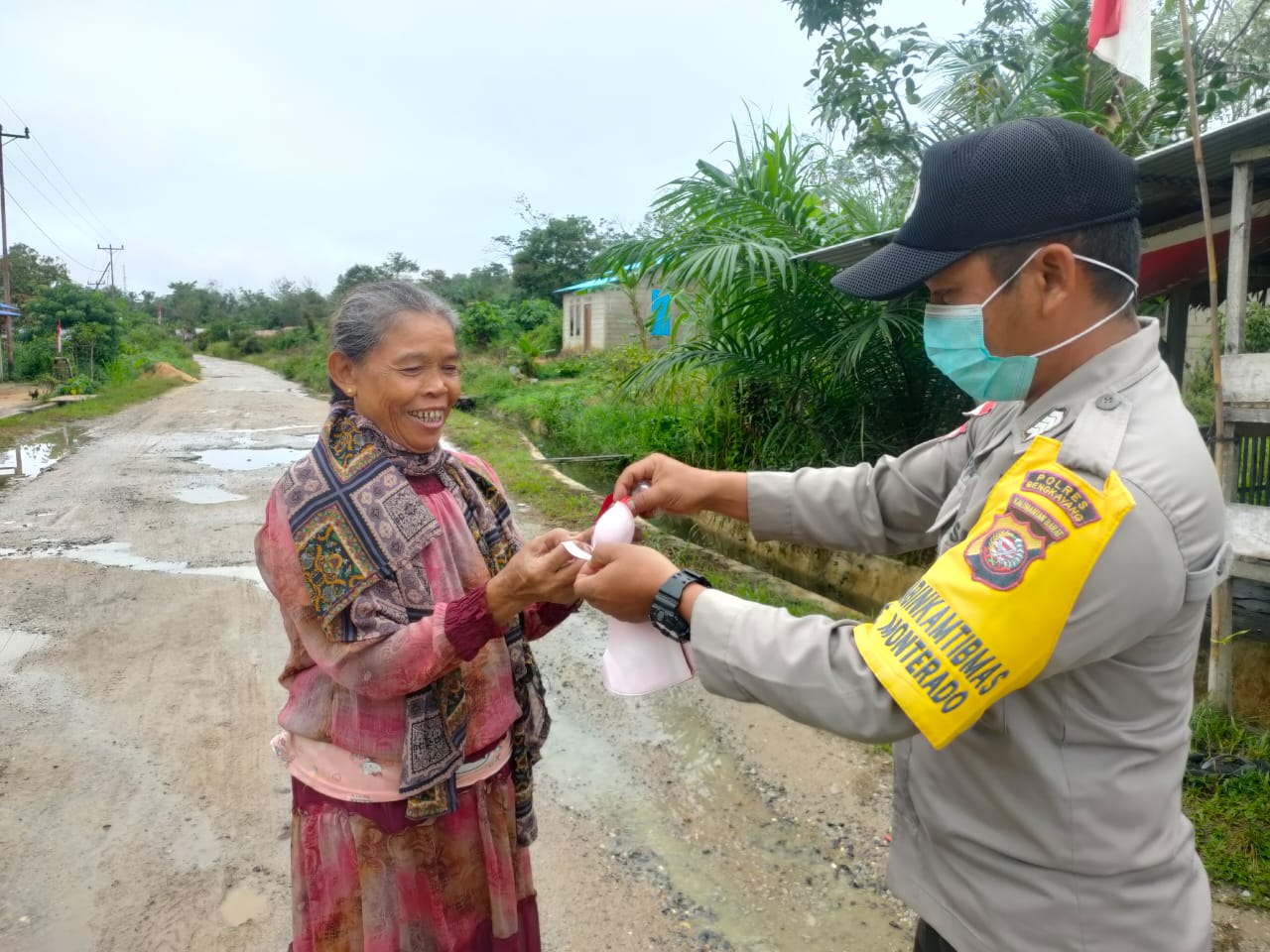 Polres Bengkayang – Polsek Monterado. Bripka Pepel dalam rangka mencegah Covid19 memberikan masker gratis kepada masyarakat Desa Monterado Kec. Monterado, Sabtu(15/08).