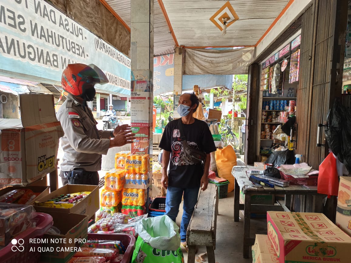 Polres Bengkayang, Polsek Monterado- Bhabinkamtibmas Polsek Monterado Bripka Pepel melaksanakan Patroli siang di pertokoan dan mengedukasi warga Kec. Monterado terkait disiplin Protokol Kesehatan 5M, Rabu (25/08)siang.