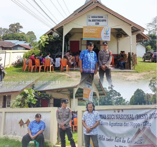 Selain melaksanakan piket jaga Polsek Ledo, BRIPTU RIYAN berikan pengamanan saat ibadah di gereja Katolik Sto AGUSTINUS HIPPO di jalan raya Ledo, serta melaksanakan “Minggu kasih”., Aiptu Agus Ulil menemui pendeta Alexander Manggi untuk membicarakannya/menyampaikan pesan – pesan kamtibmas baik memarkirkan kendaraan dalam keadaan telah terkunci ganda saat ibadah maupun memasang camera CCTV dirumah ibadah/sekitarnya, Minggu, (24/09/2023).