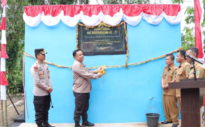 Bengkayang, Kalbar – Karolog Polda Kalbar Kombes Pol Cahyo Widagdo, S.ST, M.K. dan Kapolres Bengkayang menghadiri peresmian Baksos Pembangunan Penampungan Air Bersih Umum Oleh Kapolri dan Bansos Polda Kalbar dalam rangka Hut Bhayangkara ke-77 dengan tema “Polri Presisi Untuk Negeri Pemilu Damai Menuju Indonesia Maju”. Kegiatan Bakti Sosial yang berlangsung di Dusun Riam Pelayo, Desa..
