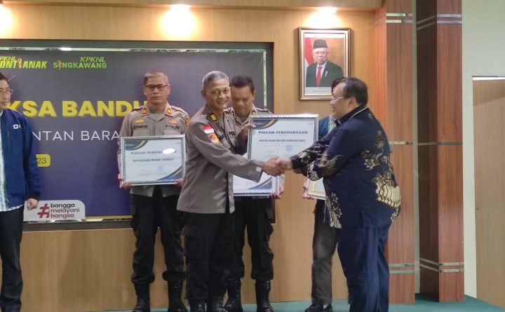 Bengkayang, Kalbar – Kepolisian Resor Bengkayang Polda Kalbar menerima penghargaan Anugerah Reksa Bandha Kanwil DJKN Kalimantan Barat dengan kategori sebagai pelaksanaan sertifikasi Barang Milik Negara (BMN) terbaik Tahun 2022. Kegiatan tersebut digelar oleh Kantor Wilayah Direktorat Jenderal Kekayaan Negara Kalimantan Barat yang bertujuan mengapresiasi kepada para stakeholders atas sinergi dan dukungan dalam pengelolaan kekayaan negara..