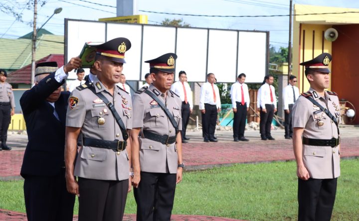 Bengkayang, Kalbar – Kapolres Bengkayang AKBP Dr. Bayu Suseno, S.H., S.I.K., M.M., M.H., memimpin Upacara Pengukuhan Kabaglog dan Serah Terima Jabatan Kasatreskrim, bertempat di Halaman Mapolres Bengkayang, Rabu (15/2/2023) pagi. Upacara ini diikuti oleh seluruh Pejabat Utama Polres Bengkayang, Kapolsek jajaran, Personel Polri dan ASN Polres Bengkayang serta sejumlah perwira yang melaksanakan pengukuhan dan serah..
