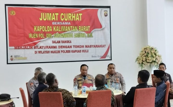Kapuas Hulu – Kapolda Kalimantan Barat Irjen Pol Drs. Suryanbodo Asmoro, M.M., didampingi Pejabat Utama Polda Kalbar dan Wakapolres Kapuas Hulu Kompol Hilman Malaini, S.H., S.I.K., M.H., melaksanakan Jum’at Curhat yang bertujuan untuk mendengarkan keluhan dan aspirasi warga masyarakat perbatasan Kabupaten Kapuas Hulu. Kegiatan Jum’at Curhat tersebut dilaksanakan di PLBN Badau, Kabupaten Kapuas Hulu, Jum’at..