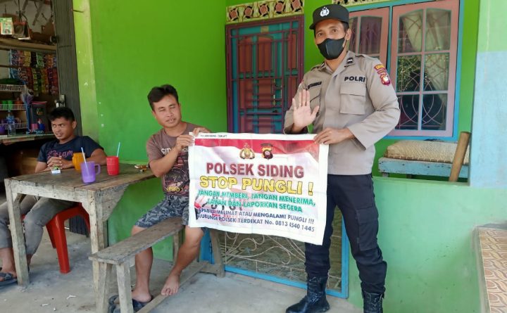 Polsek Siding Polres Bengkayang Polda Kalbar giatkan himbaun Stop Pungli. Minggu (08/01/23) Stop Pungli terus digiatkan personel Polsek Siding melalui himbaun pada saat melaksanakan Patroli dialogis hal ini mewujudkan wilayah bebas dari Pungutan Liar, KKN, atau perbuatan pemerasan. Aipda Boni Setiawan pada penyampaian himbauan kamtibmas hal ini juga mengingatkan masyarakat agar tidak melakukan praktek pungli..