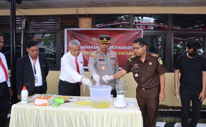 Polres Sintang menggelar press release pengungkapan kasus tindak pidana narkotika di wilayah hukum Polres Sintang sekaligus pemusnahan barang bukti narkoba di halaman Mapolres Sintang, Senin (14/8). Pada press release yang dipimpin langsung oleh Kapolres Sintang AKBP Dwi Prasetyo Wibowo tersebut turut juga dihadirkan kedua pelaku yang masing-masing berinisial H alias Mbok dan M alias Aat…