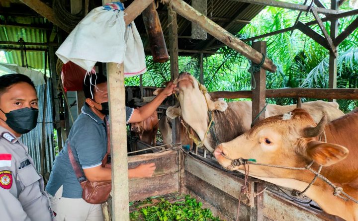 Polres Bengkayang beserta seluruh Polsek Jajaran terus melakukan pemantauan dan pengawasan hewan untuk mencegah penyebaran penyakit mulut dan kuku (PMK) pada hewan ternak. Seperti yang dilakukan oleh Bhabinkamtibmas Kel.Bumi Emas Polsek Bengkayang , Sabtu (05/8/2022) mendatangi salah satu warga yang memiliki peternakan sapi. Kepada Pemilik Peternakan Wardi (42) dan Bhabinkamtibmas berpesan agar selalu menjaga kesehatan..