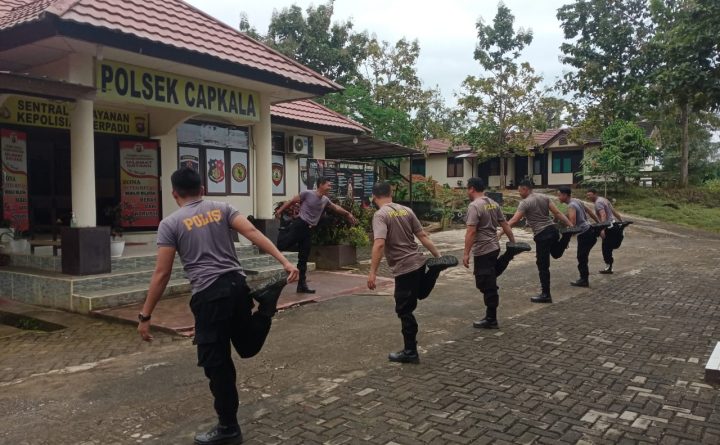 http://Tribratanews.polri.go.idPolsek Capkala- Polres Bengkayang- Polda Kalbar. Personil Polsek Capkala melaksanakan olahraga bersama di halaman mapolsek capkala, Jum’at (27/01/2023). Tujuan dilaksanakan olahraga bersama adalah untuk menjaga kebugaran tubuh, sehingga dapat melaksanakan tugas dengan baik. Kegiatan olahraga hari ini dipimpin langsung oleh Kapolsek Capkala IPTU Hasan Abdullah, SH.,MH. dan diikuti anggotanya. Giat olahraga dimulai dengan jalan santai..