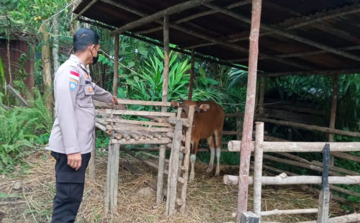 Tribratanews.polri.go.id.Polda Kalbar,Polres Bengkayang,Polsek Jagoi Babang gencar melakukan pencegahan penularan PMK melalui pengecekan hewan ternak milik warga untuk mencegah penularan PMK (Penyakit Mulut Dan Kaki) terhadap hewan ternak milik warga. Seperti yang di lakukan oleh Brigadir Anggong selaku Bhabinkamtibmas desa gersik pada Jumat (29/7/2022) pagi, Mendatangi kandang peternak sapi milik salah satu warga dusun bantang jaya,..