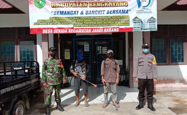 polres bengkayang, Polsek jagoi babang-bhabinkamtibmas desa sekida, babinsa desa sekida, perangkat desa dan satgas covid 19 melakukan penyemprotan disinpektan di tempat umum dan pemukiman warga untuk mencegah terjadinya penularan covid 19 Sabtu (19/6/2021) Mengantisipasi dan mencegah terjadinya penularan virus covid 19, bhabinkamtibmas briptu jeri dan satgas covid 19 desa sekida melakukan penyemprotan cairan disinpektan di..