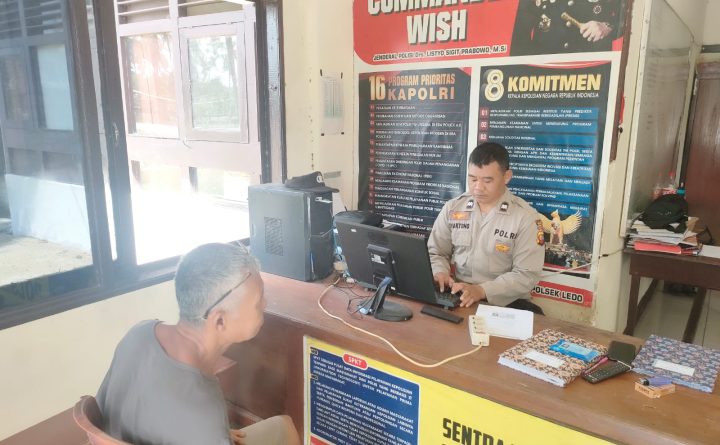 Tribratanews.polri.go.id – Sebagai Aparat Pelayan, Pengayom dan Pelindung masyarakat, Polri dituntut untuk senantiasa humanis dalam melayani masyarakat. Hal tersebut dibuktikan oleh Ka SPKT 3 Polsek Ledo Aiptu Nyartono dalam melayani pembuatan surat keterangan kehilangan Kamis tanggal (12/01/2023). Nampak pelayanan di ruang SPK dan membuatkan surat keterangan kehilangan ATM warga masyarakat Desa Lesabela, dengan 3S (senyum..