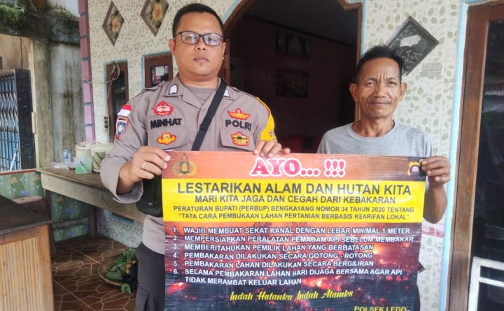 Tribratanews.polri.go.id Polda Kalbar Polres Bengkayang Polsek Ledo Dalam upaya mengantisipasi kebakaran hutan dan lahan (Karhutla), Polsek Ledo jajaran Polres Bengkayang Polda Kalbar, melaksanakan sosialisasi dan himbauan kepada masyarakat tentang larangan pembakaran hutan dan lahan menggunakan banner. Seperti yg terlihat Bhabinkamtibmas Polsek Ledo melaksanakan himbauan dan sosialisasi karhutla dilaksanakan di Desa Semangat Kecamatan ledo Kabupaten Bengkayang..