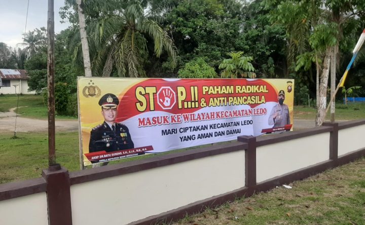Polres Bengkayang – Dalam rangka upaya pencegahan paham Radikalisme dan Anti Pancasila Polsek Ledo Polres Bengkayang Polda Kalbar pasang spanduk himbauan untuk penolakan terhadap ajaran Radikalisme dan Terorisme di depan Mako Polsek Ledo, Kamis (21/07/2022). Pemasangan spanduk merupakan penolakan terhadap segalan bentuk ajaran maupun aliran Radikalisme dan Terorisme di wilayah hukum Polsek Ledo. “Hal tersebut..