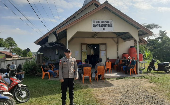 Personil Spkt 2 Polsek Ledo Polres Bengkayang Polda Kalbar selalu hadir disetiap ada giat masyarakat untuk memberikan rasa aman pada saat masyarakat sedang beribadah di wilayah hukum Polsek Ledo pada Minggu ( 24/07/2022 ) pagi hari. Dalam rangka pelaksanaan PAM Ibadah Gereja Kuasi Paroki Santo Agustinus Ledo yang berlangsung pukul 08.00 Wib dilaksanakan personil piket..