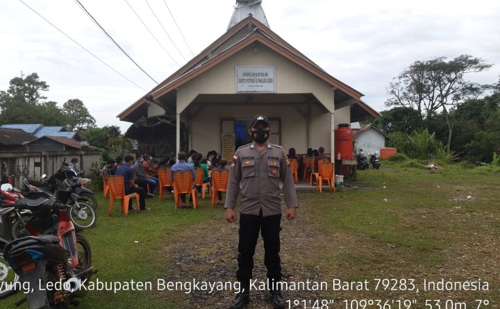Polres Bengkayang – Polsek Ledo, Salah satu tugas Polri adalah sebagai pengemban Harkamtibmas sudah sewajarnya selalu siap dalam melaksanakan pelayanan prima seperti pam kegiatan pengamanan (PAM) di Gereja pada hari Minggu (07/11/2021) Pkl 09.00 Wib. Kegiatan Pengamanan serta monitoring tersebut dilaksanakan oleh Kanit Samapta Bripka IG Guntur dengan Brigadir M. Nabil di Gereja Katholik Santo..