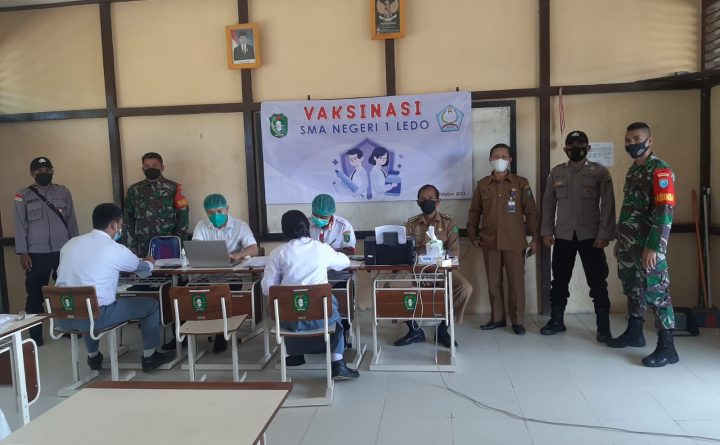 Anggota Polsek ledo melaksanakan kegiatan pengamanan (Pam) dan monitoring kegiatan Vaksinasi covid19 di SMAN 1 Kecamatan Ledo. Senin/4/Oktober/2021. Anggota Polsek Ledo memberikan pelayanan Kepolisian berupa Pengamanan (Pam) di SMAN 1 Ledo pada saat pelaksanaan vakisnasi covid19 terhadap anak Sekolah di SMAN 1 Ledo. Hari ini Senin tanggal 04 Oktober 2021 dilaksanakan vaksinasi covid19 bagi anak..