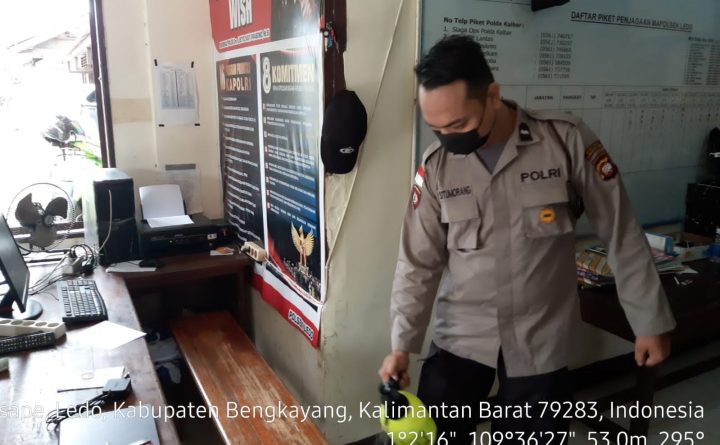 Guna untuk mencegah dan memutus penyebaran virus Covid-19. Personil piket Polsek Ledo melaksanakan penyemprotan cairan disinfektan di mako Polsek Ledo, Rabu (14/7/2021) Penyemprotan cairan disinfektan dilakukan menyeluruh, mulai dari pintu masuk utama pelayanan SPKT (Sentra Pelayanan Kepolisian Terpadu), ruang pelayanan SPKT, ruangan pelayanan SKCK, ruang tamu Kapolsek, sampai dengan ruang pelayanan pemeriksaan unit Reskrim Polsek..
