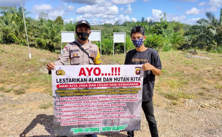 Upaya mencegah terjadinya kebakaran hutan atau lahan (karhutla) terus dilakukan oleh Bhabinkamtibmas Polsek Ledo dengan memberikan imbauan serta sosialisasikan stop karhutla dengan menggunakan banner kepada warga Desa Semangat , Kecamatan Ledo Kabupaten Bengkayang, Rabu (07/07/2021). Seperti yang terlihat Briptu Tan Deden selalu mengajak warganya agar bersama sama menjaga lingkungan sekitar dari bahaya karhutla dan tidak..