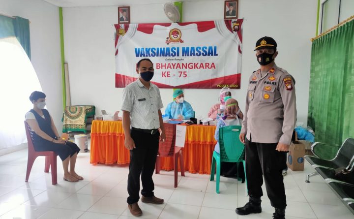 Polres Bengkayang – Dalam rangka Hari Bhayangkara ke-75 Polsek Ledo Polres Bengkayang Polda Kalbar laksanakan Vaksinasi Massal. wWrga tampak antusias mengikuti vaksinasi massal yang di laksanakan di puskesmas Ledo, Kamis (24/06/2021). Kapolsek Ledo Iptu Asep Maulana terjun langsung kelapangan memimpin anggotanya untuk melakukan pengamanan dan pengawalan di tempat berlangsungnya penyuntikan vaksin tersebut. Personil Polsek Ledo,..