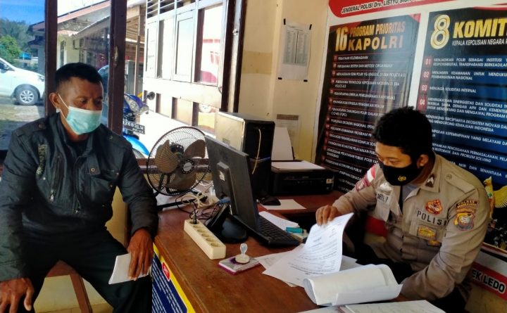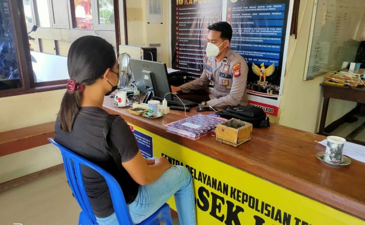 Anggota Jaga Regu II Polsek Ledo Polres Bengkayang, Polda Kalbar Briptu Tan Deden berikan pelayanan prima kepada masyarakat yang membuat Laporan Kehilangan Barang (LKB), Barang yang hilang berupa Kartu ATM Bank BRI unit Ledo, Senin (07/06/2021). Penerimaan LKB merupakan satu diantara produk unggulan Polsek Ledo dalam memberikan pelayanan primanya kepada masyarakat. Satu di antara warga..