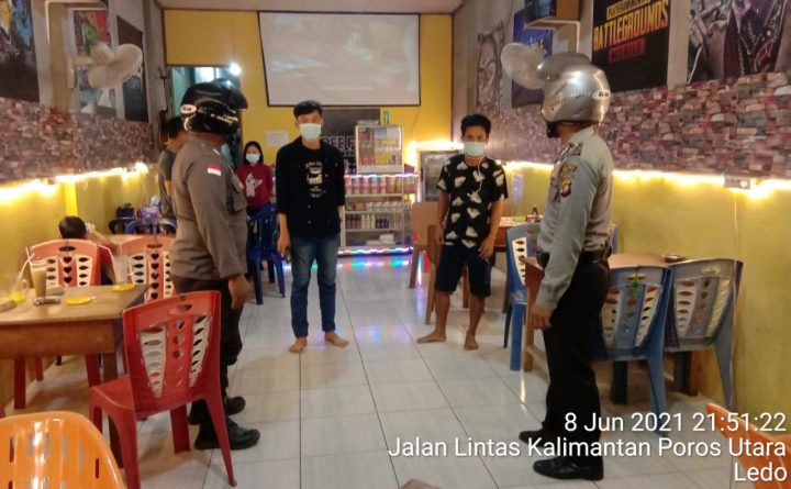 Dalam rangka memutus mata rantai dan menekan penyebaran Covid-19 di Kab. Bengkayang khususnya di Kec. Ledo, jajaran Bhabinkamtibmas Polsek Ledo Polres Bengkayang terus lakukan Patroli dan sambang memberikan himbauan dan sosialisasi Protokol Kesehatan berupa 3M (Memakai Masker, Mencuci Tangan, Menjaga Jarak) dan memonitor kegiatan PPKM diwilayah hukum Polsek Ledo, Sabtu (5/6/2021). Pengawasan kegiatan PPKM dilakukan..