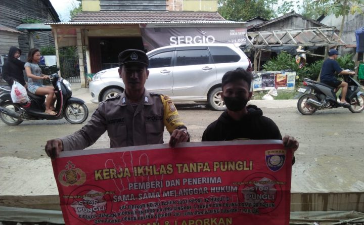 Tribratanews.polri.go.id- Membentangkan banner Pungli cara Bhabinkamtibmas Polsek Monterado Bripka Gustian sampaikan pesan anti pungli dan suap kepada warga binaan yang dijumpainya diseputaran pasar Monterado, Kamis (5/01/2023). Saat bersama dengan warga binaan Bripka Gustian membentangkan banner kecil menyampaikan, “agar kita selalu menolak Pungutan liar (Pungli) penerima dan pemberi dapat dijerat hukum”, ucapnya. “Pungli dapat di jerat..