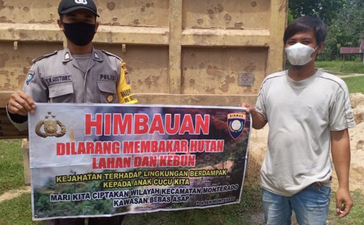 Bhabinkamtibmas Polsek Monterado Brigadir Gustian bersama warga Kec. Monterado bentangkan banner dalam mencegah terjadinya Karhutla di wilayah hukum Polsek Monterado, Selasa (14/09). Bhabinkamtibmas Brigadir Gustian menyampaikan dengan humanis, agar warga dapat memahami akibat dan sanksi hukum terhadap pembakar hutan dan lahan. “Membuka lahan dengan cara membakar dapat merusak lingkungan dan mengakibatkan polusi udara serta ada..