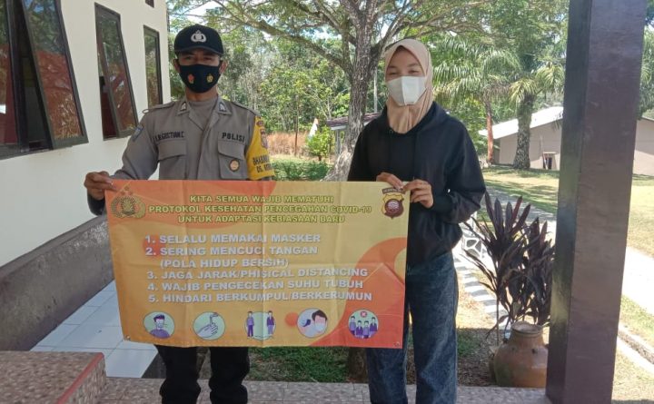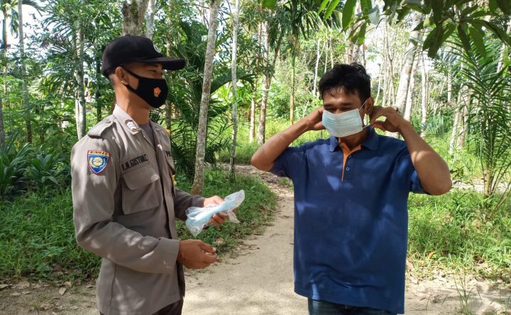 Polres Bengkayang, Polsek Monterado-Pihak Kepolisian Sektor Monterado disiplinkan Protokol Kesehatan Covid19 ke warga masyarakat Kec. Monterado dalam mencegah penularan wabah Virus Covid19 di Wilayah Hukum Polsek Monterado. Salah satu upaya rutin yang dilaksanakan yakni pendisiplinan memakai masker ke warga masyarakat Kec. Monterado dalam beraktifitas sehari-hari, Senin (09/08/2021). Bhabinkamtibmas Polsek Monterado Brigadir Gustian memberikan masker gratis..