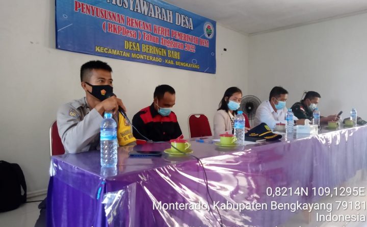 Polres Bengkayang, Polsek Monterado- Bhabinkamtibmas Desa Beringin Baru Brigpol I.Nyoman Gustian hadiri kegiatan Musyawarah Desa RKPDes Ta. 2022 berbasis SDGs Beringin Baru Kecamatan Monterado Kabupaten Bengkayang bertempat di aula Kantor Desa Beringin Baru. Kegiatan tersebut dilaksanakan hari Rabu tanggal 11 Agustus 2021 jam 09.00 wiba dan dihadiri oleh Kasi Kesos Fransiska Samarai, S.E , Pendamping..