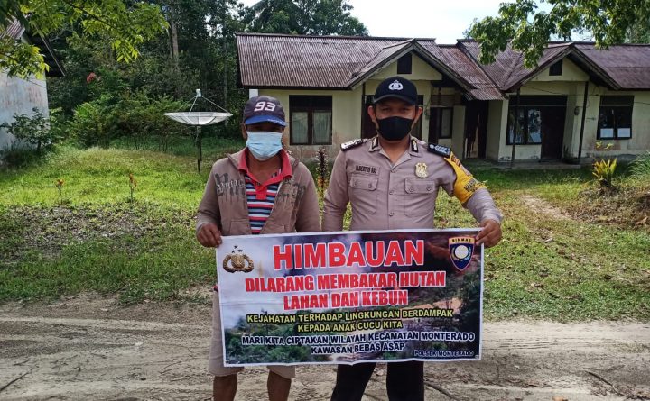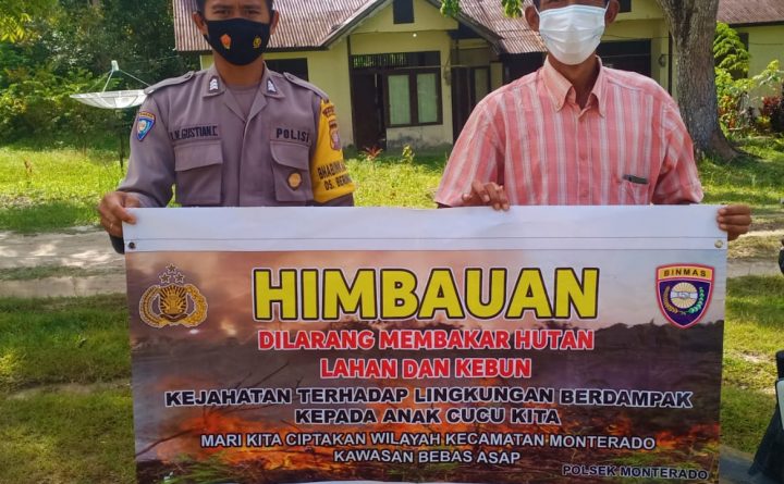 polres bengkayang,polsek Monterado- Bhabinkamtibmas Polsek Monterado Bripka Rio ajak warganya bersama cegah Karhutla, Kamis(05/08). Dalam mencegah Karhutla disampaikan Bripka Rio dengan humanis gunakan banner Kecil, agar warga dapat memahami akibat dan sanksi hukum terhadap pembakar hutan serta lahan. “Membuka lahan dengan cara membakar dapat merusak lingkungan dan ada ketentuan hukum yang dikenakan bagi pelaku pembakarnya”,..