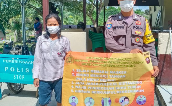 Polres Bengkayang, Polsek Monterado- Bhabinkamtibmas Polsek Monterado Bripka Suprianus rutin sampaikan himbauan Protokol Kesehatan dengan banner 5M kepada warga masyarakat Kec. Monterado, Selasa(27/7). Dalam kegiatan ini, Bhabinkamtibmas Bripka Suprianus memberikan edukasi dan menyampaikan himbauan dengan media banner agar warga mudah memahami serta tetap waspada penyebaran virus Covid19 dengan selalu menerapkan Protokol Kesehatan 5 M. Kapolsek..