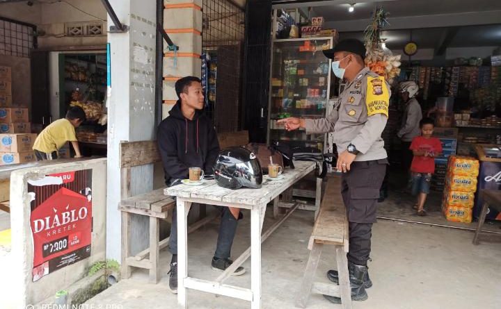 Polres Bengkayang – Polsek Monterado. Bhabinkamtibmas Polsek Monterado Bripka Pepel melaksanakan Patroli di seputaran pasar Monterado Desa Monterado Kec. Monterado, ciptakan rasa aman dan kondusif serta disiplinkan masyarakat tentang penerapan Protokol kesehatan Covid19 5M, Kamis (05/05/2021). Saat patroli Bripka Pepel mendapati warga binaan yang tidak memakai masker dan memberinya teguran lisan atas pelanggaran protokol kesehatan..