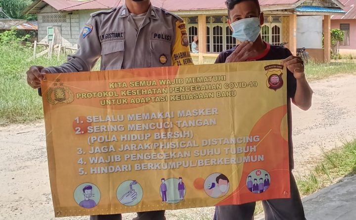 Polres Bengkayang, Polsek Monterado- Bhabinkamtibmas Polsek Monterado Brigadir I.Nyoman Gustian rutin sampaikan himbauan Protokol Kesehatan dengan banner 5M kepada warga masyarakat Kec. Monterado, Senin (7/6/2021). Dalam kegiatan ini, Bhabinkamtibmas Brigadir I.Nyoman Gustian memberikan Edukasi dan menyampaikan himbauan dengan media banner agar tetap waspada penyebaran virus Covid19 dengan selalu menerapkan Protokol Kesehatan 5 M. Kapolsek Monterado..