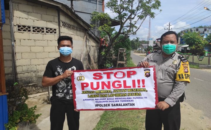 Polres Bengkayang – Polsek Samalantan. Polsek Samalantan Polres Bengkayang tak henti-hentinya melakukan upaya Preemtif untuk Stop Pungutan Liar (Pungli) dengan sosialisasi atau kampanye kepada seluruh elemen masyarakat. Seperti yang dilakukan Aipda Erixon Simanjuntak kepada warga dengan memberikan edukasi serta pemahaman pentingnya tindakan Stop Pungli melalui media spanduk, Selasa (15/6/2021) pagi. Kapolsek Samalantan, Ipda Nusantara Sembiring..