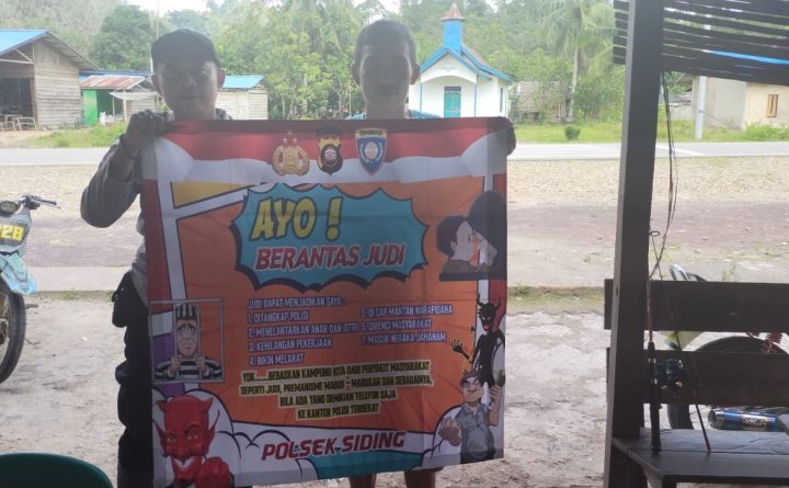 Personel Polsek Siding Polres Bengkayang Polda Kalbar beri himbaun masyarakat tentang stop Praktek Judi di wilayah kecamatan Siding. Jumat (03/02/23) Himbauan dilakukan pada kegiatan patroli dialogis desa Siding kecamatan Siding kabupaten Bengkayang. Pada kesempatan Bripka Nandang Prasojo menemui pemilik Warkop Dius guna mengajak masyarakat tolak kejahatan, dan menyampaikan pesan Kamtibmas baik itu informasi menciptakan situasi..