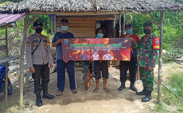 Anggota Polsek Sungai Raya Kepulauan Bripda Anang Rianda bersama Babinsa dan Warga Sungai Raya sosialisasikan dan mengajak masyarakat untuk mencegah kebakaran hutan dan lahan menggunakan banner guna mencegah penyebaran kebakaran hutan lahan di Desa Sungai Raya agar masyarakat lebih mengetahui bahaya dan akibat dari pembakaran yang dilakukan , Senin Pagi(05/07/2021) di Desa Sungai Raya. Salah..