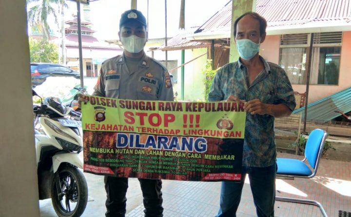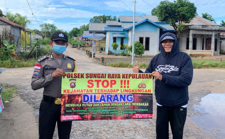 Anggota Polsek Sungai Raya Kepulauan Briptu Dwi Tesa sosialisasikan kebakaran hutan dan lahan menggunakan banner guna mencegah penyebaran kebakaran hutan lahan kepada masyarakat Desa Sungai Keran agar masyarakat lebih mengetahui bahaya dan akibat dari pembakaran yang dilakukan , Rabu pagi(16/06/2021) di Desa Sungai Keran. Salah satunya dengan Bapak Deri dimana Anggota Polsek Sungai Raya Kepulauan..
