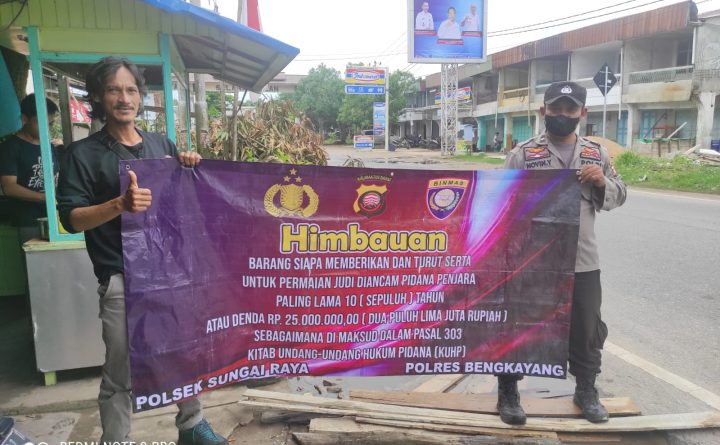 Polsek Sungai Raya – Polres Bengkayang – Polda Kalbar Pada hari ini Sabtu tanggal 04 September 2022, sekira jam 09.00 Wiba, Personil Polsek Sungai Raya melaksanakan kegiatan himbauan kepada masyarakat tentang perjudian maupun tindak pidana lainnya. Pada kegiatan tersebut Personil Polsek Sungai Raya melaksanakan kegiatan dengan mengunakan Benner dengan isinya adalah, Himbauan’ Barang siapa memberikan..