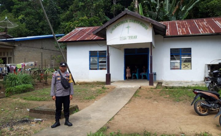 Anggota polsek Teriak memberikan pelayanan kepada masyarakat berupa pengamanan ibadah Minggu di Gereja Katholik, Minggu (14/05/2023). Kegiatan pengamanan ini dilakukan oleh anggota Polsek Teriak yang dilakukan pada saat masyarakat sedang melaksanakan kegiatan ibadah Minggu di Gerja Katholik Desa Teriak Kecamatan Teriak Kabupaten Bengkayang Dalam kesempatan tersebut personil polsek Teriak selain melakukan pengamanan, juga memberikan imbauan..