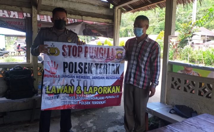 Polres Bengkayang – Kegiatan cegah Pungli rutin di laksanakan oleh personil polsek Teriak Brigadir R. Deli, Kamis (03/06/2021). Pelaksanaan giat menyampaikan imbauan stop Pungli di wilayah kecamatan Teriak terlaksana secara rutin oleh personil polsek setempat kepada warga. Hal tersebut tampak pada pelaksanaannya yang di laksanakan setiap hari dengan menggunakan benner yang di dalamnya sudah tercantum..