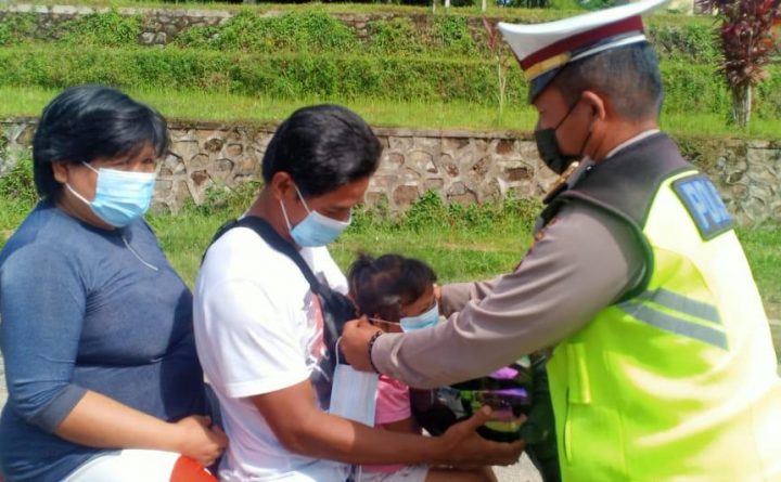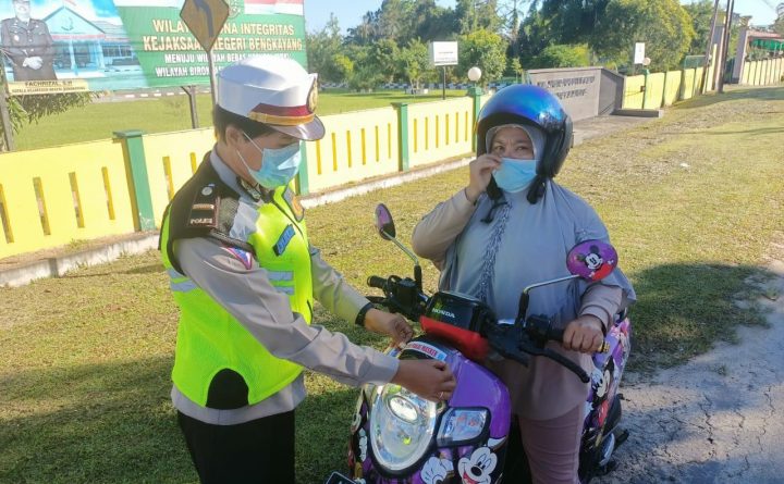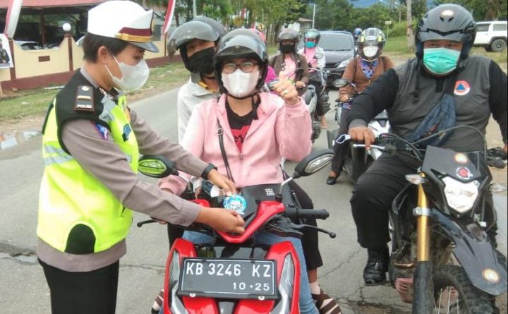 Bengkayang – Salah satu wujud peduli Keselamatan oleh Kanit Laka Lantas Polres Bengkayang dalam menciptakan keamanan, keselamatan dan ketertiban berlalu lintas kepada pengendara sepeda motor yang tidak gunakan Helm SNI dan berikan masker gratis guna pencegahan penyebaran Covid 19 di jalan Perwira Bengkayang, Senin (28/06/2021). Dengan sangat ramah dan humanis Kanit Laka lantas Iptu Simanjuntak..