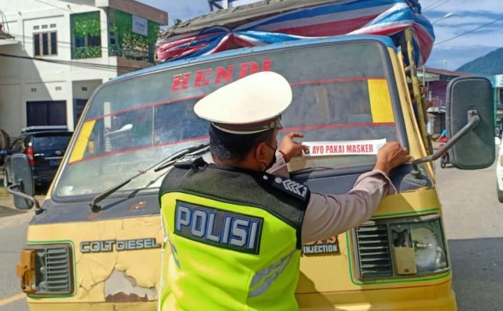 Bengkayang – Satuan Lalulintas Polres Bengkayang terus melakukan aksi pencegahan penyebaran virus Covid-19 di wilayah hukum Polres Bengkayang. Kegiatan pencegahan dilakukan dengan melakukan aksi bagi-bagi masker secara gratis dan penempelan stiker pencegahan Covid-19 pada Sabtu 03 Juli 2021. Hal itu pun dilakukan sebagai pengingat agar masyarakat khususnya pengguna jalan yang melintas di wilayah hukum Polres..