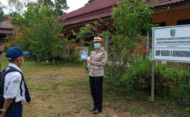Polres Bengkayang – Kanit Dikmas Lantas Polres Bengkayang beserta anggota mengimbau dan mensosialisasikan kepada pelajar di SMPN 4 Bengkayang melalui himbauan untuk mematuhi peraturan lalu lintas dan menerapkan protokol kesehatan guna mencegah penularan Corona Virus Disease (Covid-19). Rabu (30/06/2021 ). Kasat Lantas Polres Bengkayang, AKP Tri Teguh Mulyono, S.H. mengatakan penerapan protokol kesehatan bagi pelajar..
