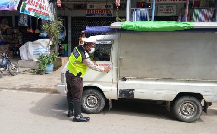 Bengkayang – Dalam rangka memberikan himbauan pencegahan Covid 19, Personil Sat Lantas Polres Bengkayang terus menerus melaksanakan penempelan stiker ayo pakai masker di Jalan Ngura Bengkayang, Senin (14/06/2021). Kampanye keselamatan cegah covid 19 berupa penempelan stiker ini dilaksanakan setiap pagi saat melakukan kegiatan Gatur Lalu Lintas dan Penling. Kegiatan itu bertujuan untuk mengingkatkan kesadaran masyarakat..