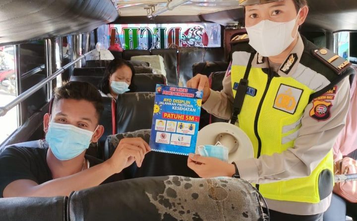 Kanit Dikmas Sat Lantas Polres Bengkayang Polda Kalbar melaksanakan sosialisasi himbauan protokol kesehatan di Terminal Bengkayang, Jum’at (18/06/2021). Kanit Dikmas Lantas Polres Bengkayang Ipda Pariani beserta anggota melakukan blusukan ke bus untuk mensosialisasikan himbauan prokes Covid-19 kepada sopir bus maupun penumpang bus yang sedang parkir di Terminal Bengkayang. Sosialisasi dan himbauan dilakukan dengan membagikan brosur..