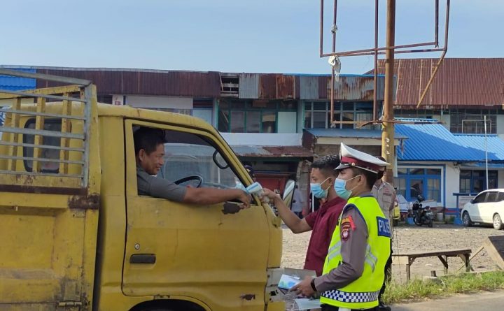 Bengkayang- Salah satu kegiatan Personil Sat Lantas Polres Bengkayang dalam rangka Memutus mata rantai penyebaran covid 19 yaitu melakukan Pembagian masker bagi masyarakat pengguna jalan yang tidak menggunakan masker di Jalan Raya Sungai Raya Kab. Bengkayang “Kegiatan kita pagi ini, yakni memberikan edukasi protokol kesehatan Covid 19 sesuai anjuran pemerintah dan pembagian masker kepada masyarakat..