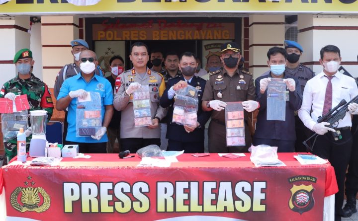 Polres Bengkayang Polda Kalbar gelar kembali press release terkait pengungkapan narkotika jenis sabu di bulan Agustus 2022. Dalam press release kali ini, tampak hadir pihak dari Pamtas, BNN, Rutan Kelas IIB Bengkayang dan juga pihak dari Pengadilan Negeri Bengkayang. Ada lima tersangka yang di tangan Polres Bengkayang. Dan satu tersangka perempuan yang merupakan tahanan kasus..