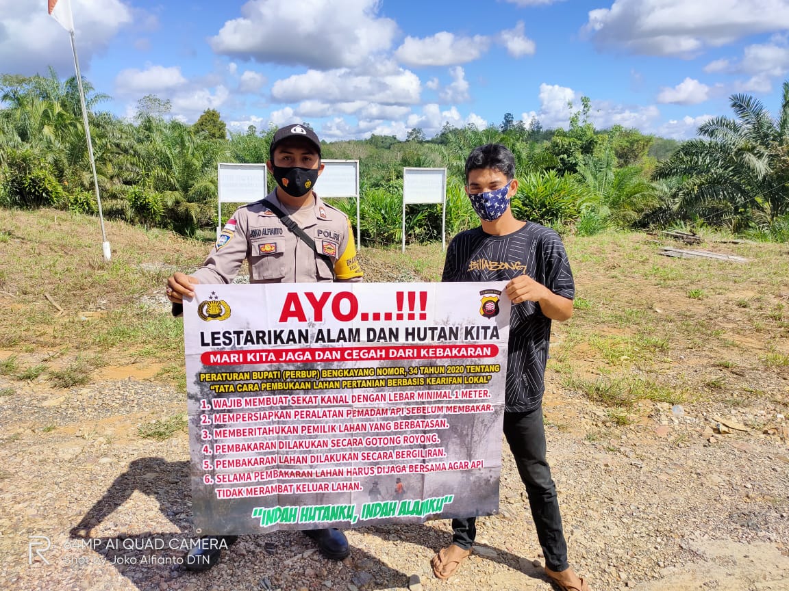 Upaya mencegah terjadinya kebakaran hutan atau lahan (karhutla) terus dilakukan oleh Bhabinkamtibmas Polsek Ledo dengan memberikan imbauan serta sosialisasikan stop karhutla dengan menggunakan banner kepada warga Desa Semangat , Kecamatan Ledo Kabupaten Bengkayang, Rabu (07/07/2021).