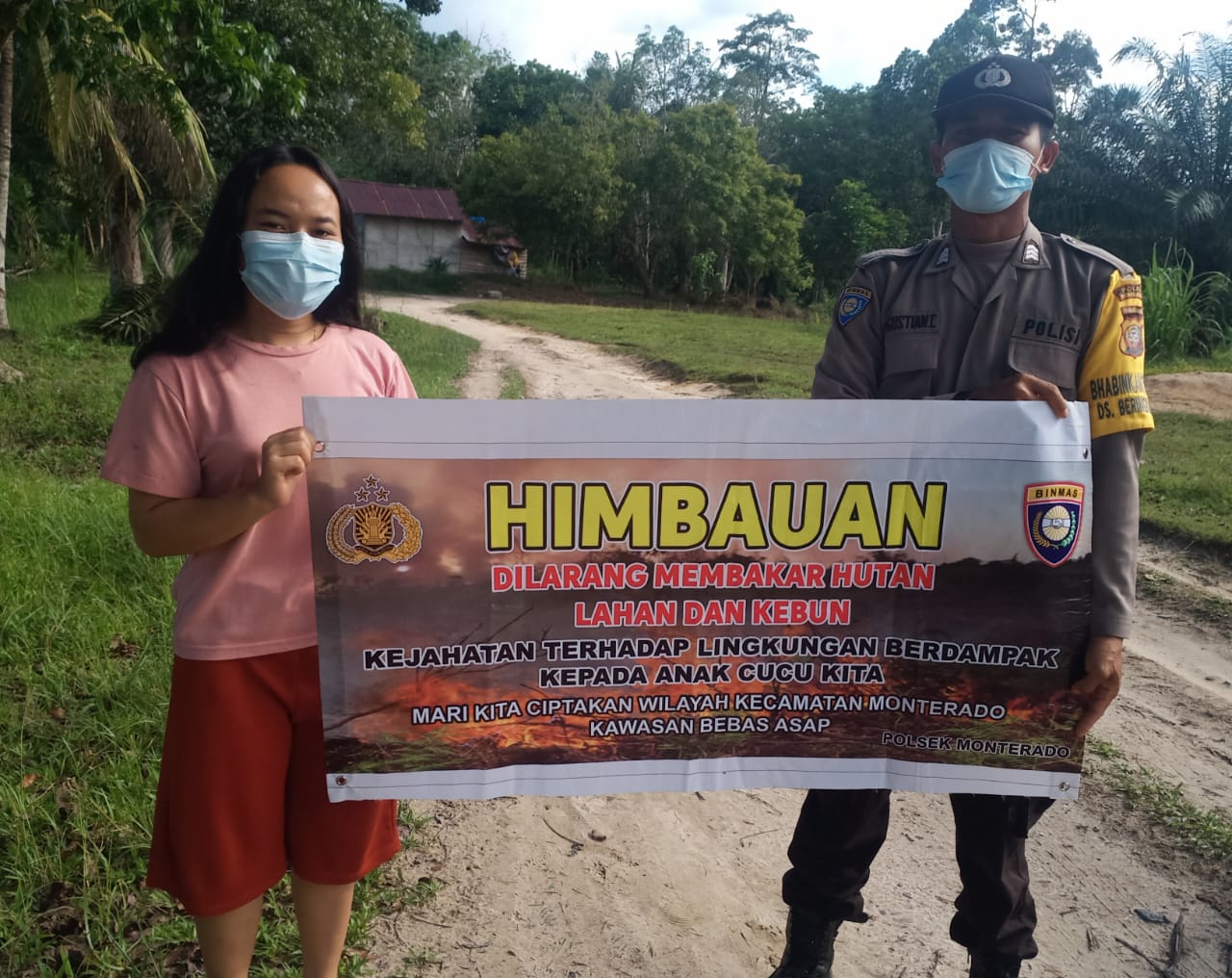 Polres Bengkayang, Polsek Monterado-Bhabinkamtibmas Polsek Monterado Brigadir Gustian dalam rangka mencegah terjadinya kebakaran hutan dan lahan (Karhutla) membentangkan banner berisikan himbauan larangan membakar hutan dan lahan.
