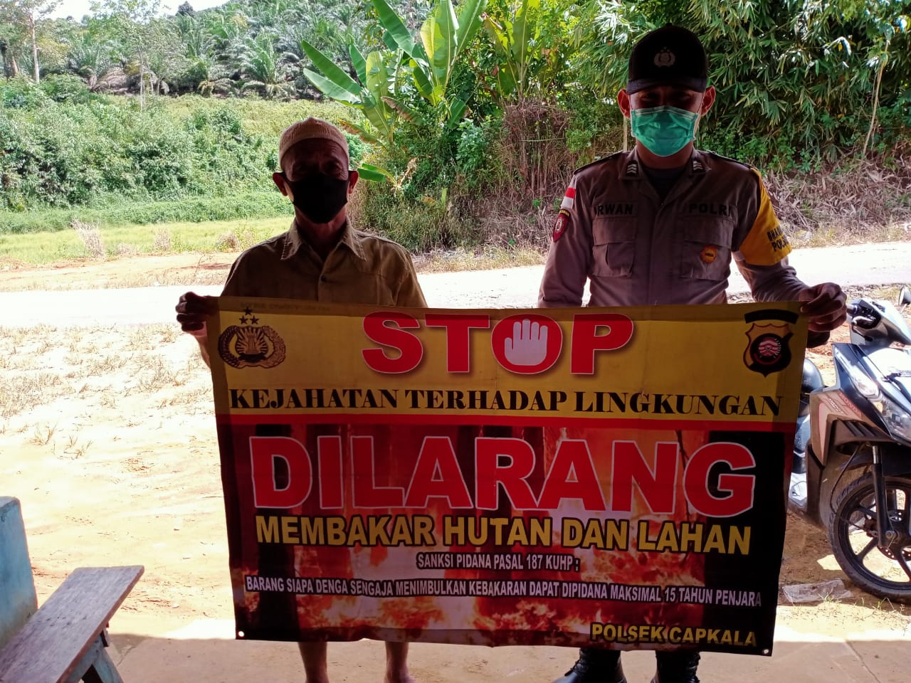 Upaya penanggulangan kebakaran hutan dan lahan terus ditingkatkan oleh jajaran Polsek Capkala, Kali ini Bhayangkara Pembina Keamanan dan Ketertiban Masyarakat (Bhabinkamtibmas) Polsek Capkala turun ke lapangan yakni Brigadir Irwan Suganda , guna memberikan imbauan-imbauan kepada warga terkait kebakaran hutan dan lahan, Sabtu, 23/10/2021.